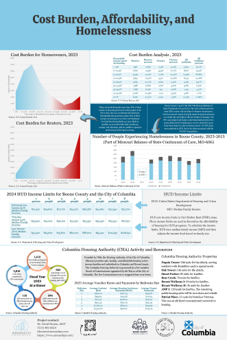 These 12 posters are produced for the Community Input Meetings held in April 2024 as part of a county-wide housing study. Includes Cost Burden, Affordability, and Homelessness; Household Composition and Housing Inventory; Housing Market Indicators Views per Listing, Time on Market, U.S. Historical New Starts; Income and Housing Costs; Labor Force, Commuting, and Migration; Map: Educational Attainment; Map: Housing Tenure; Map: Housing Unit Growth; Map: Median Home Value and Gross Rent; Map: Median Household Income; Map: Race and Ethnicity; Population Growth and Housing Unit Distribution