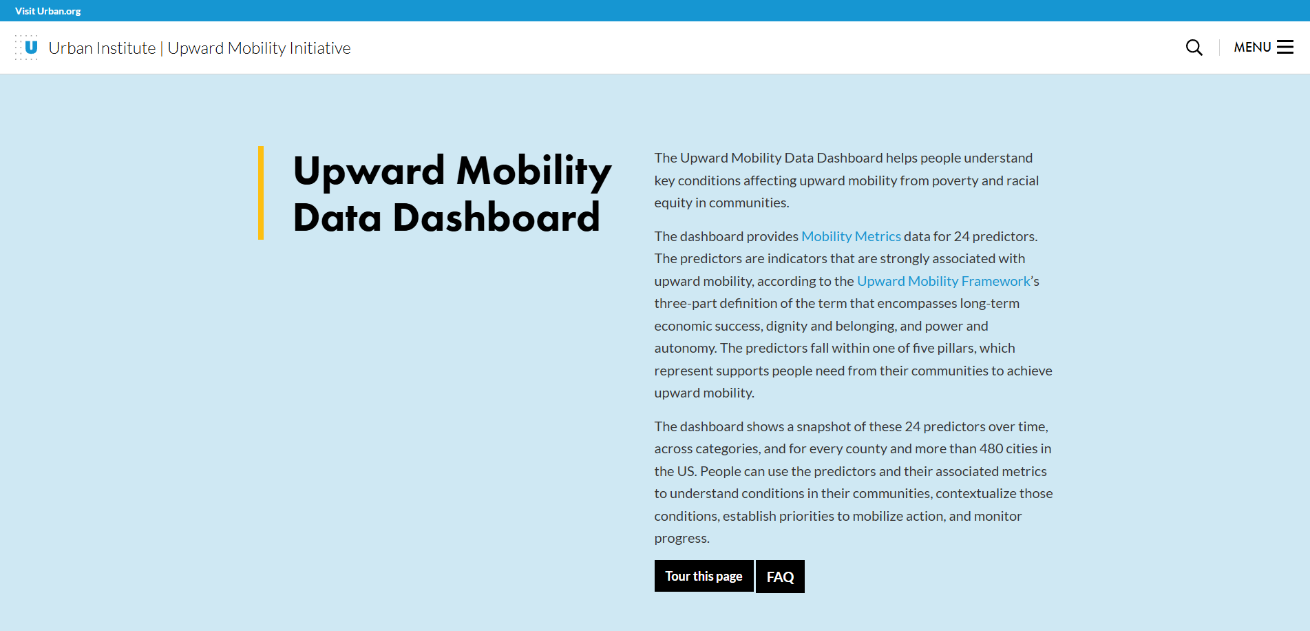 The Urban Institute Upward Mobility Data Dashboard is a platform to compare select indicators associated with the Upward Mobility Framework’s three-part definition of upward mobility that encompasses long-term economic success, dignity and belonging, and power and autonomy.